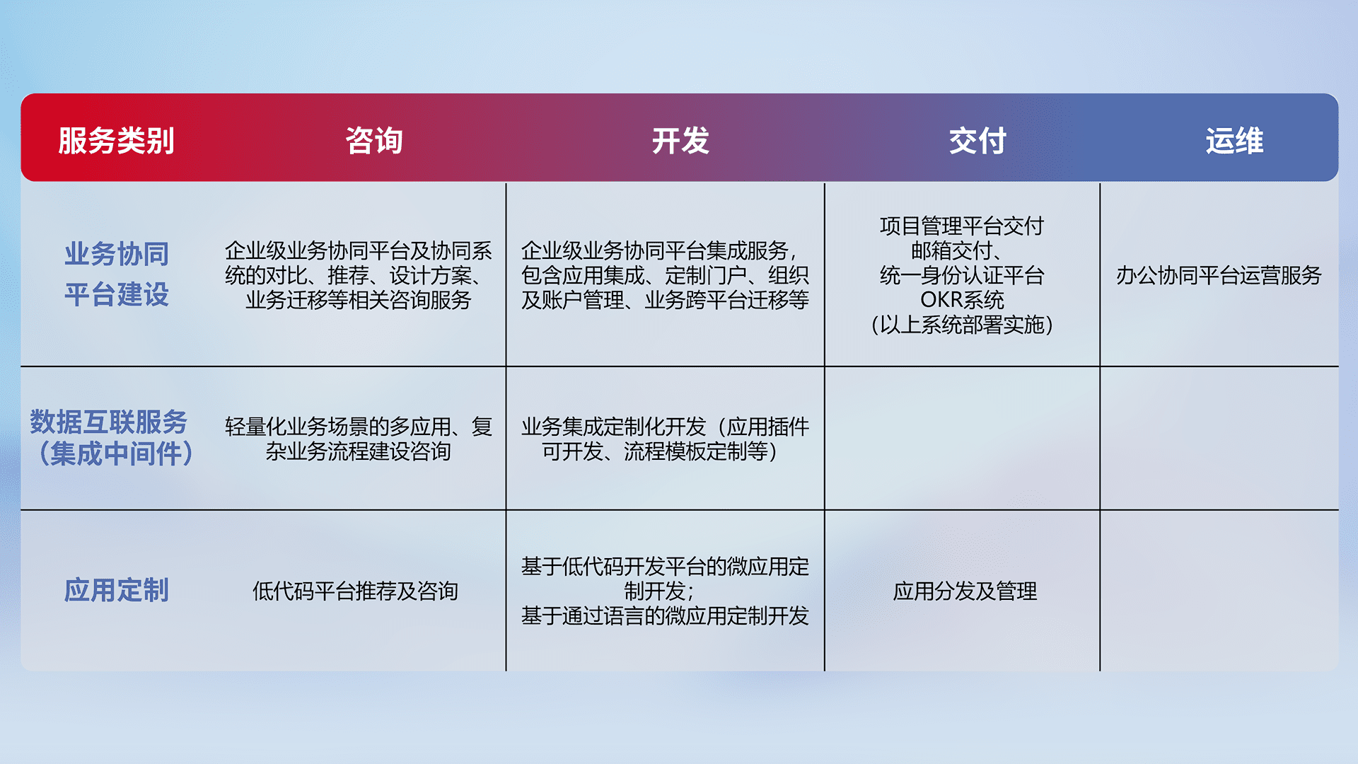 针对钉钉、、、企微、、、、IDaas等平台级产品提供产品的规划、、、、方案、、交付、、定制化开发等服务,,,,实现如统一协同办公、、、智能客户服务、、、混合会议管理、、智能数据查询、、、、等业务场景,,,实现数字化转型。。